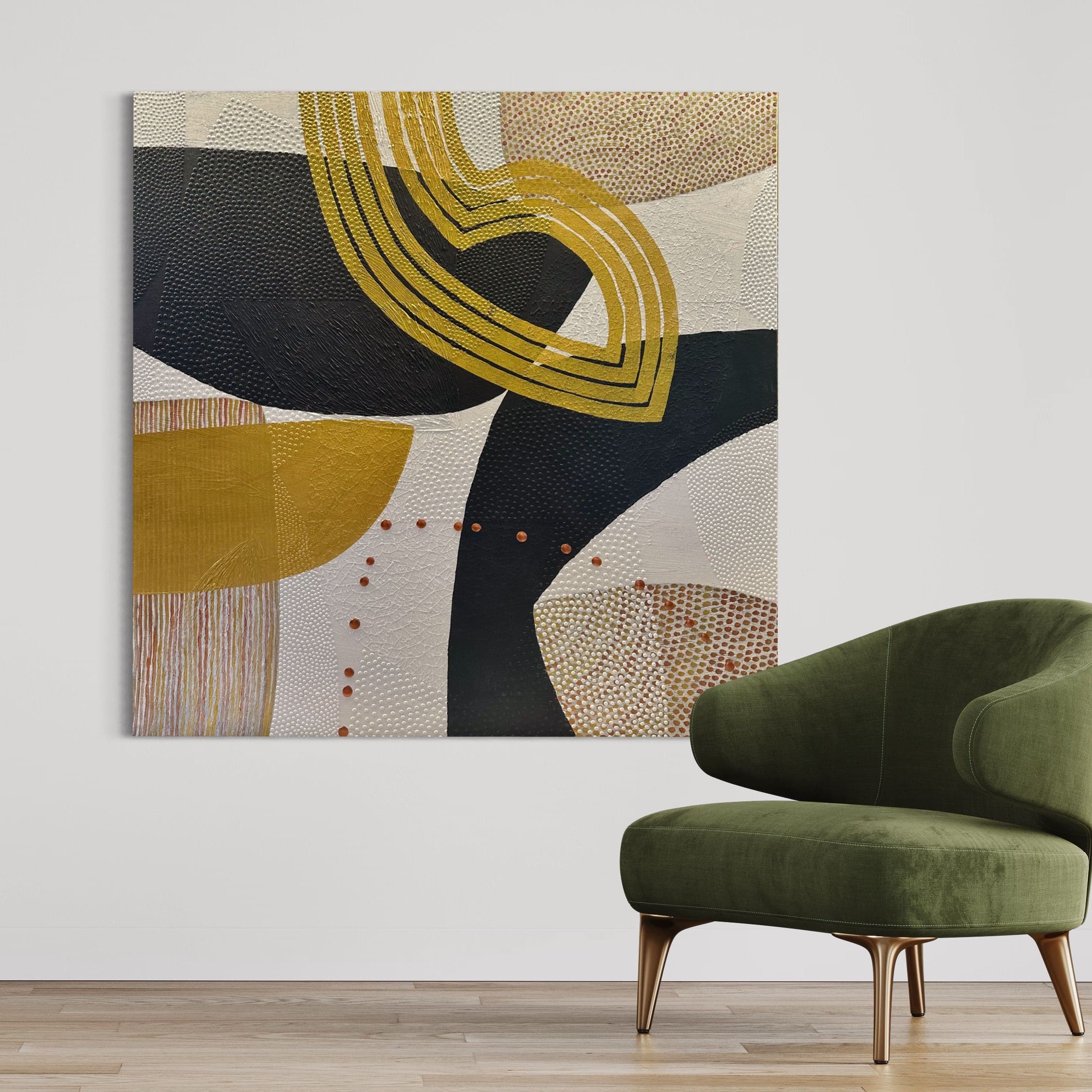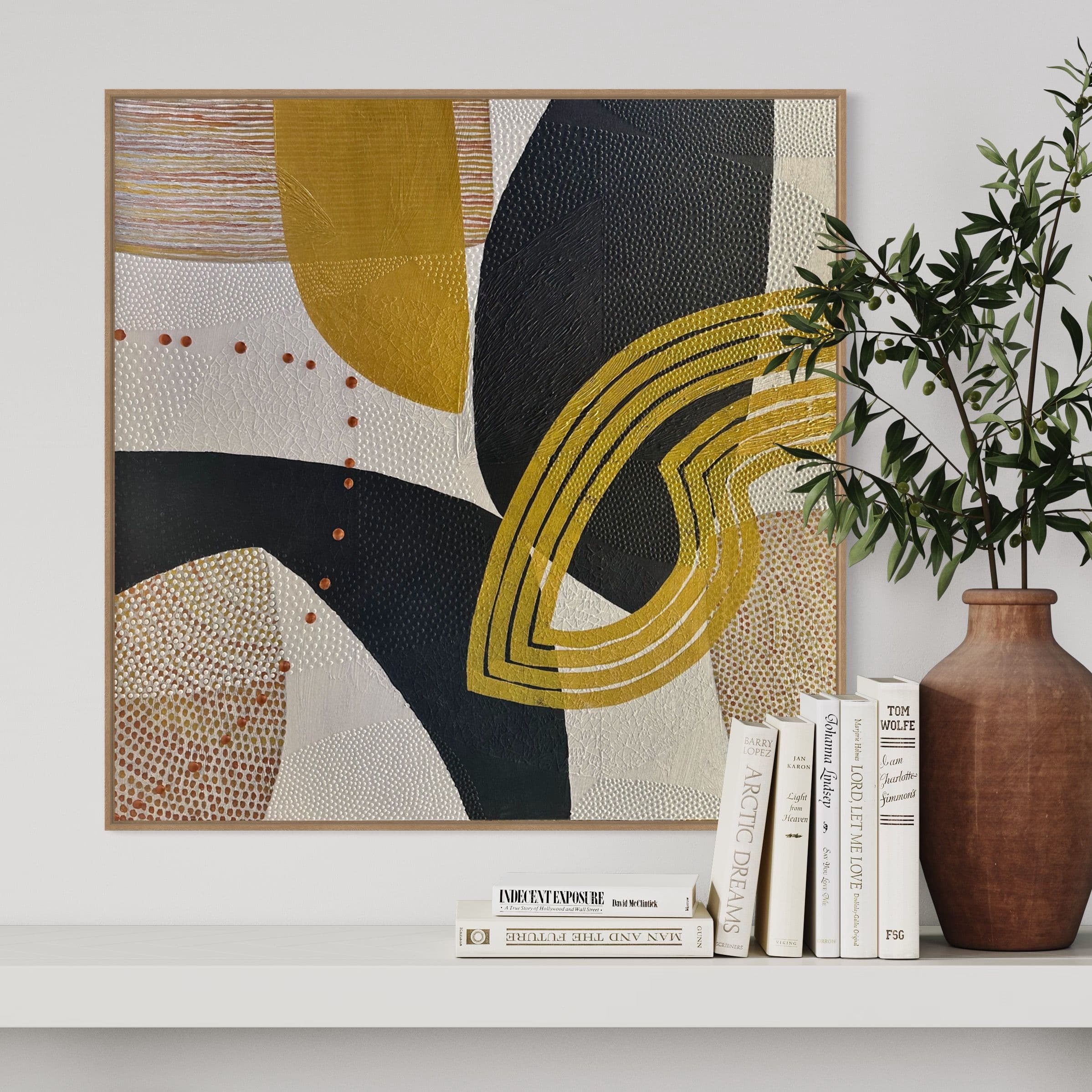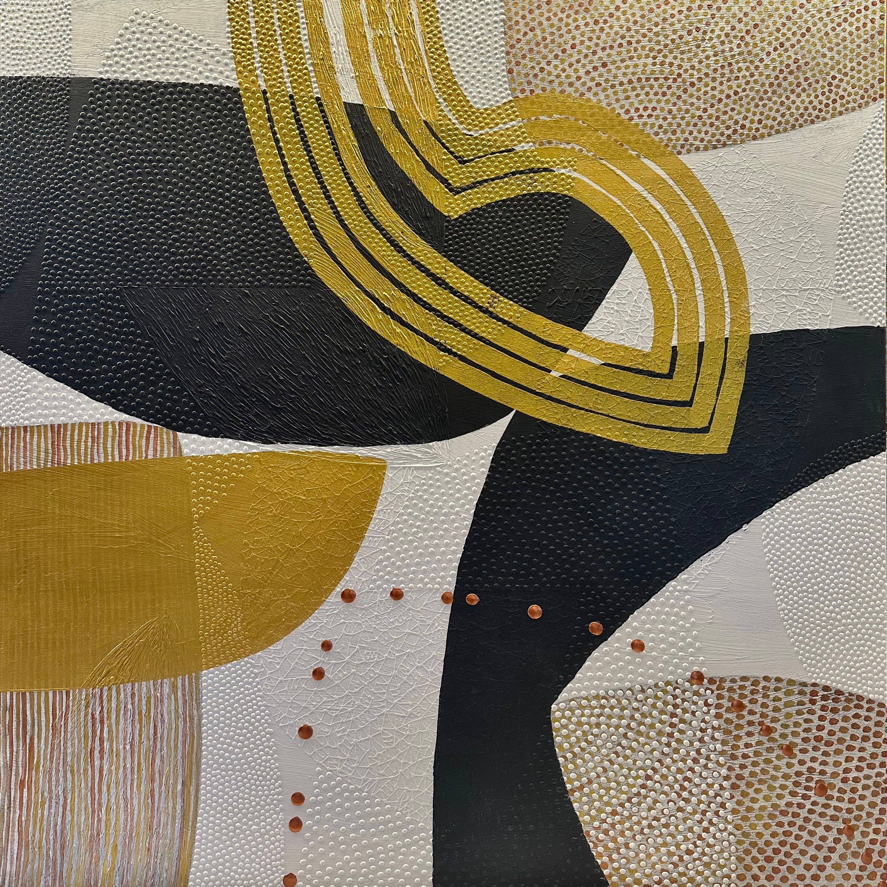 The acrylic paste creates a sculptural surface, layered with paint and enhanced with metallic colors that catch the light, adding depth and dimension to the piece.